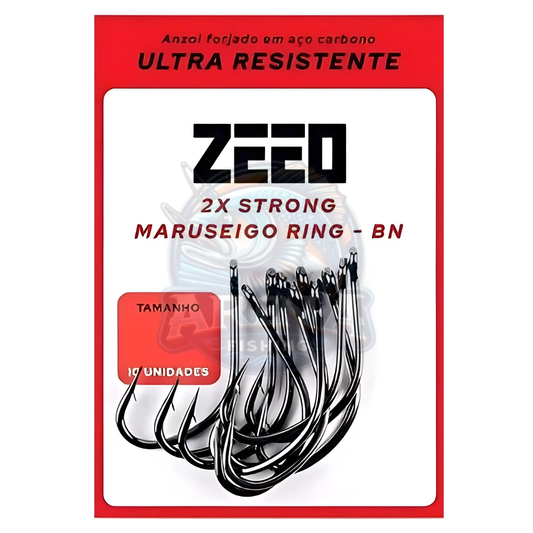 Anzol ZEEO Anzol ZEEO 2X Strong Maruseigo Ring -BN é forjado em aço carbono (BN) ULTRA RESISTENTE . Ponta com farpa . Haste chapada .Olhar anelar (aberto). Perfil inclinado